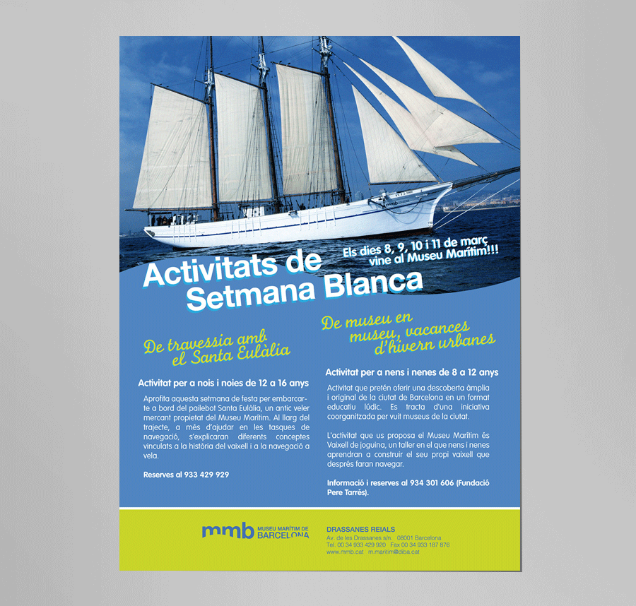 Diseño gráfico, gráfica publicitaria, promoción de las actividades del Museu Marítim de Barcelona. En colaboración con el departamento de comunicación del museo.